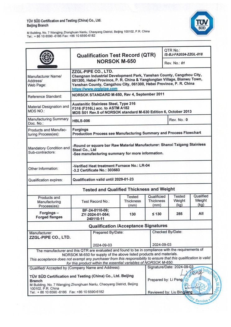 公司已通過挪威國家石油標準NORSOK M-650 ASTM A182 F316(F316L)認證。